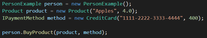 In that case, we can change which payment method the method will use at runtime, by passing an implementation of IPaymentMethod via parameter.